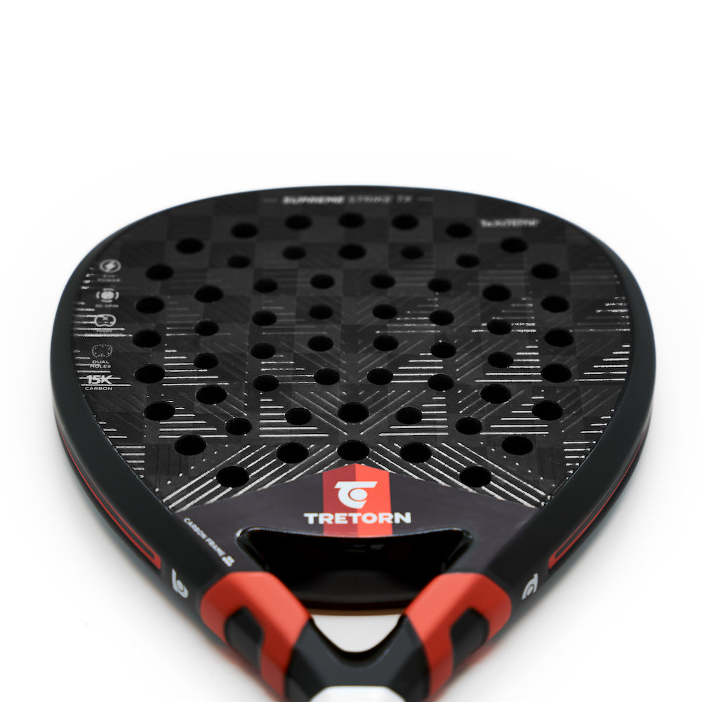 Experience the power of SUPREME STRIKE TX! Designed with precision and innovation to give you an edge in your offensive game. SUPREME STRIKE TX is developed for experienced players. The racket is equipped with a 15K carbon fiber layer from Swedish TeXtreme®, which is a thinner, stronger, and more durable surface layer that provides a quicker response compared to traditional carbon fiber constructions. Experience a new level of speed and sensation in every shot. With our EVA POWER core and a high sweetspot, the result is an extremely responsive power racket for players who mostly use their offense to dominate the game. Whether you unleash a thundering smash or execute a perfectly placed drop shot, SUPREME STRIKE TX delivers outstanding performance with every shot. The racket is also equipped with a DUAL-hole pattern that optimizes the racket's contact points, enhancing the ability for controlled shots even when hitting outside the racket's sweetspot. The result? Consistent power and precision that allow you to decide the pace of the game. Additionally, the racket features a multi-directional 3D decal, strategically designed to enhance your spin for all types of shots, bringing a new level of elegance that confuse your opponents and keeps them guessing about your next move.
